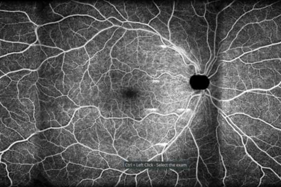 - Angiographie OCT avec fonction panoramique : ce module permet de visualiser la microvascularisation rétinienne. L'angiographie SOCT est une technique non invasive et sans colorant fournissant une image 3D de la circulation sanguine rétinienne.