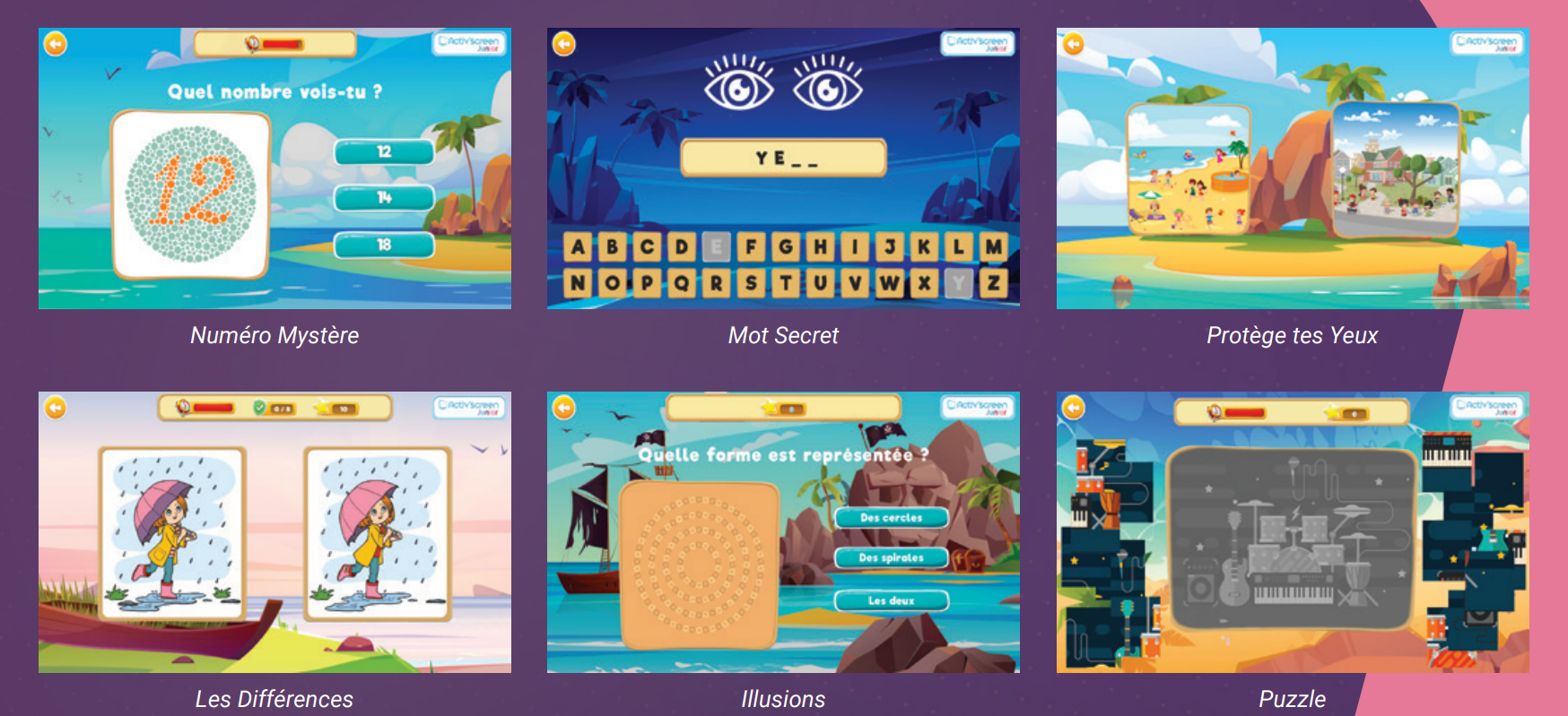 - Spécialement conçue pour gérer l’attente des plus jeunes avec 3 niveaux de jeux : 3-5 ans, 6-8 ans, 9-12 ans.